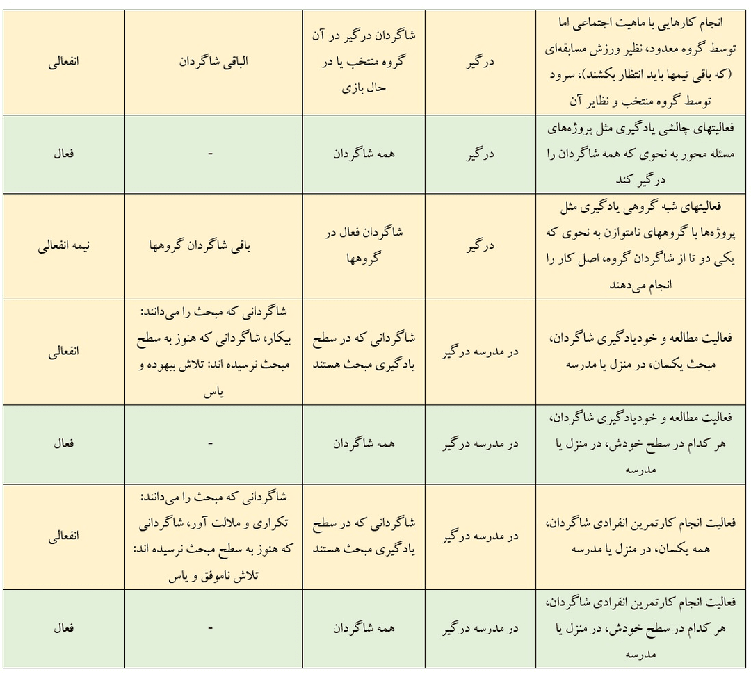 چه در شرایط حضور، و چه در شرایط فعالیت شاگرد در منزل، نوع فعالیت و طریقه مدیریت فعالتیهای شاگردان توسط مربی، میتواند شکل متفاوتی از آموزش فعال یا انفعالی را رقم بزند. طیفی از فعالیتها که در آن بخشی از شاگردان، منتظر و در حالت بلاتکلیف یا بدون کار باقی میمانند، میتواند شاگردان را به صورت ناخودآگاه به رویکرد انفعالی بکشاند.