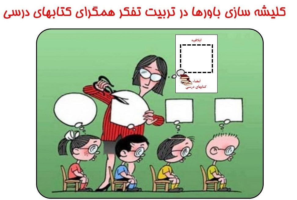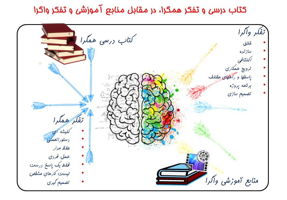 • برخورد معلم با کتاب درسی، به منزله دستور کار کاملا مشخص است. فهم شاگرد باید نسبت به موضوع، عینا آن چیزی باشد که در این فصل از کتاب درسی آمده است. نه کم و نه بیش! به زور کتابهای درسی، شاگردان را به تفکر همگرا سوق داده، و آنها را ترغیب می‌کنیم، تنها از زاویه‌ی محدودی به مسئله نگاه کنند، و فقط از روشهای قدیمی و بیان شده برای حل مسئله استفاده کنند. رویکرد کتابهای درسی، شاگردان را از تفکر واگرا و پرداختن به زوایای مختلف مسئله و راه حل‌های خلاقانه منع می‌کند، چون این راه حلهای خلاقانه، در چارچوب کتاب درسی مذکور نمی‌گنجد. در این مسیر، قدرت تفکر، خلاقیت و هویت شاگردان از بین رفته، و توانمندی آنها به سطح مجریان دستورالعملهای کاملا مشخص تقلیل پیدا می‌کند. [5]