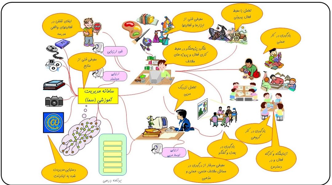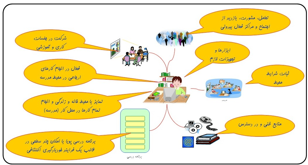 شکل زیر، ابعادی از یک محیط فعال را به تصویر میکشد. محیطی که در آن شاگرد به جای مصرف کننده محتوی، برنامه و مهارتهای از پیش تعیین شده، تولید کننده آن است و در این ساختن، دانستهها و توانمندیهای خود را ارتقاء میدهد؛ به جای اینکه بیشتر دیکته بنویسد، انشاء مینویسد؛ به جای اینکه مطالب نوشته شده در کتاب را جواب دهد یا رونویسی کند، خودش از مطالبی که از خواندن و شنیدن موضوعات مختلف برداشت کرده، گزارش و متن و مقاله مینویسد.