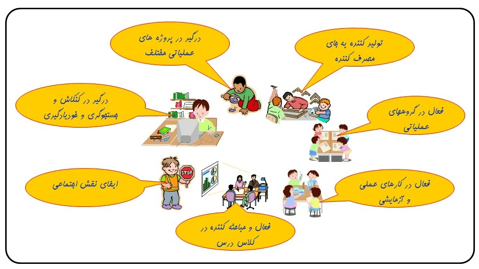 محیطی که شاگرد با شاگردان دیگر به صورت گروهی، پروژهها و فعالیتهای مشخصی را دنبال میکند؛ در کارهای عملی و آزمایشگاهی به صورت یک اکتشافگر، و نه فقط مجری چند دستورالعمل آزمایش از پیش تعیین شده و کلیشه، فعالیت میکند. او در کلاس به جای آنکه فقط شنونده سخنان معلم باشد، به صورت فعال در مباحثه شرکت میکنند، و محیط کلاس او را به درگیری فعال در بحثها و چالشگری سوق میدهد. او در مدرسه و بیرون آن، نقشهای واقعی اجتماعی را ایفا کرده، و خدمت رسانی موثری انجام میدهد. شاگرد در فرایند یادگیری در حال کنکاش و جستجوگری است، و خودیادگیری را تجربه میکند؛ و دائما در پروژههای عملیاتی مختلف درگیر میشود.